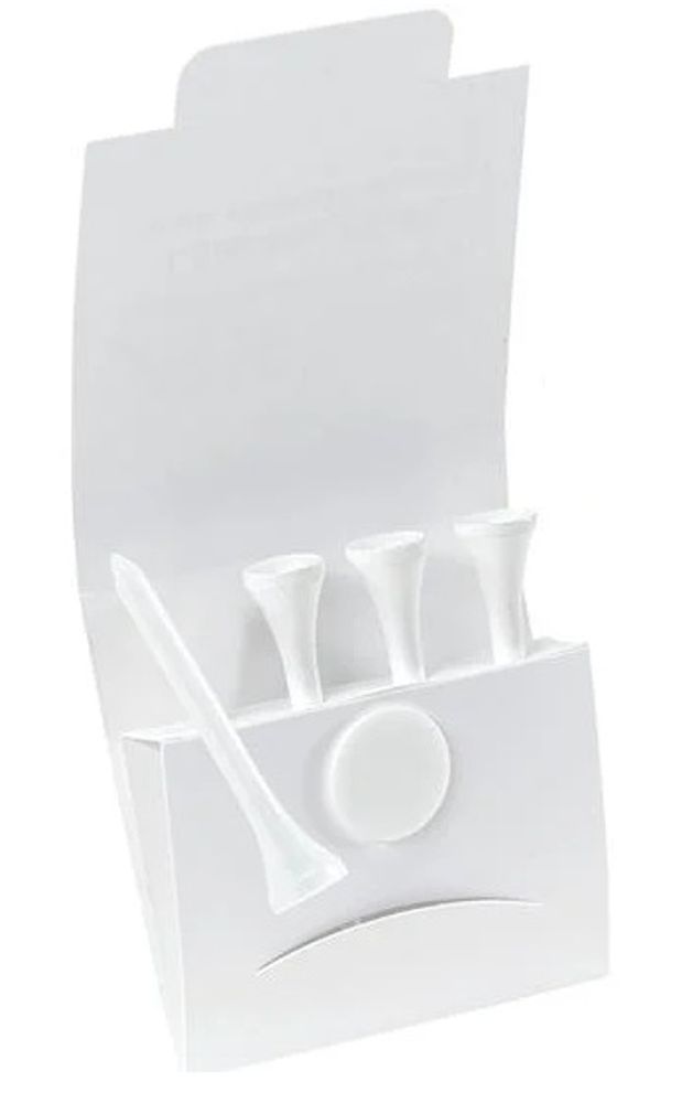This convenenent full-color printed packet includes four 2-1/8" wood tees and one plastic ball marker. Stash it in your bag so you are always ready for a round. Packet is printed and comes with white tees and ball marker which are blank.